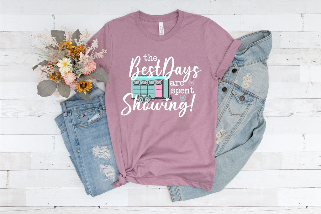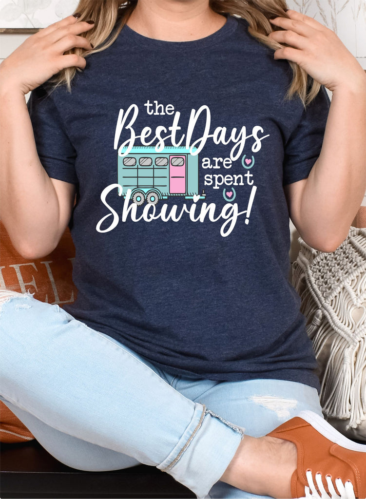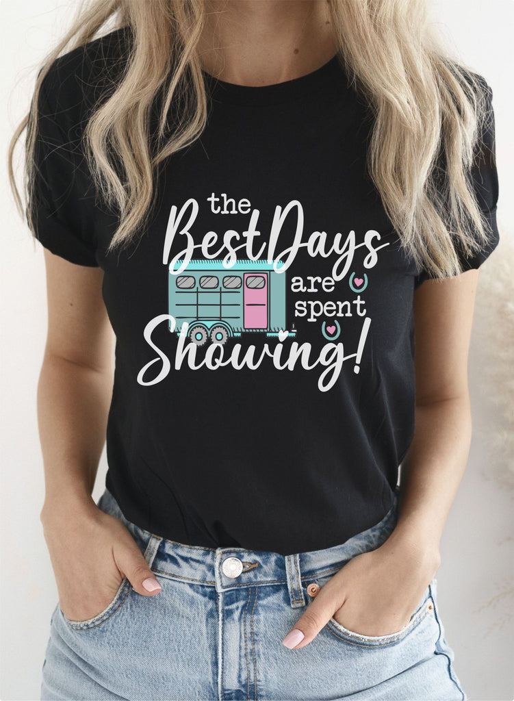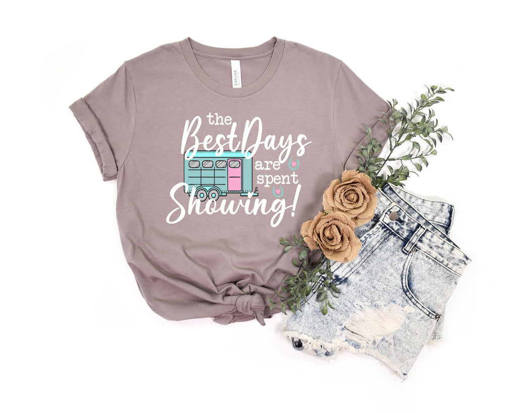 This fun and playful t-shirt is made of cotton and features a unisex fit, perfect for horse showing fans. Show your love for your favorite pastime with this cute graphic tee, boldly declaring that the best days are spent showing!