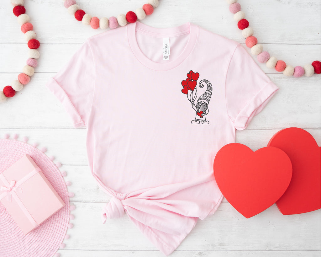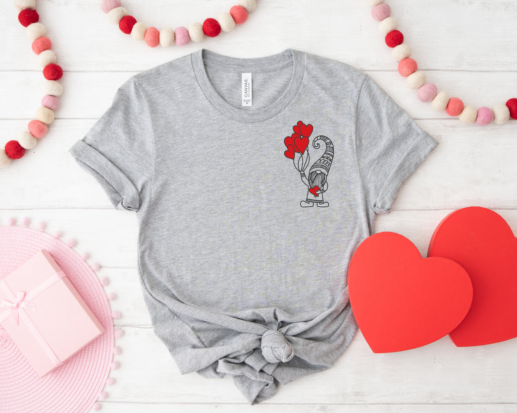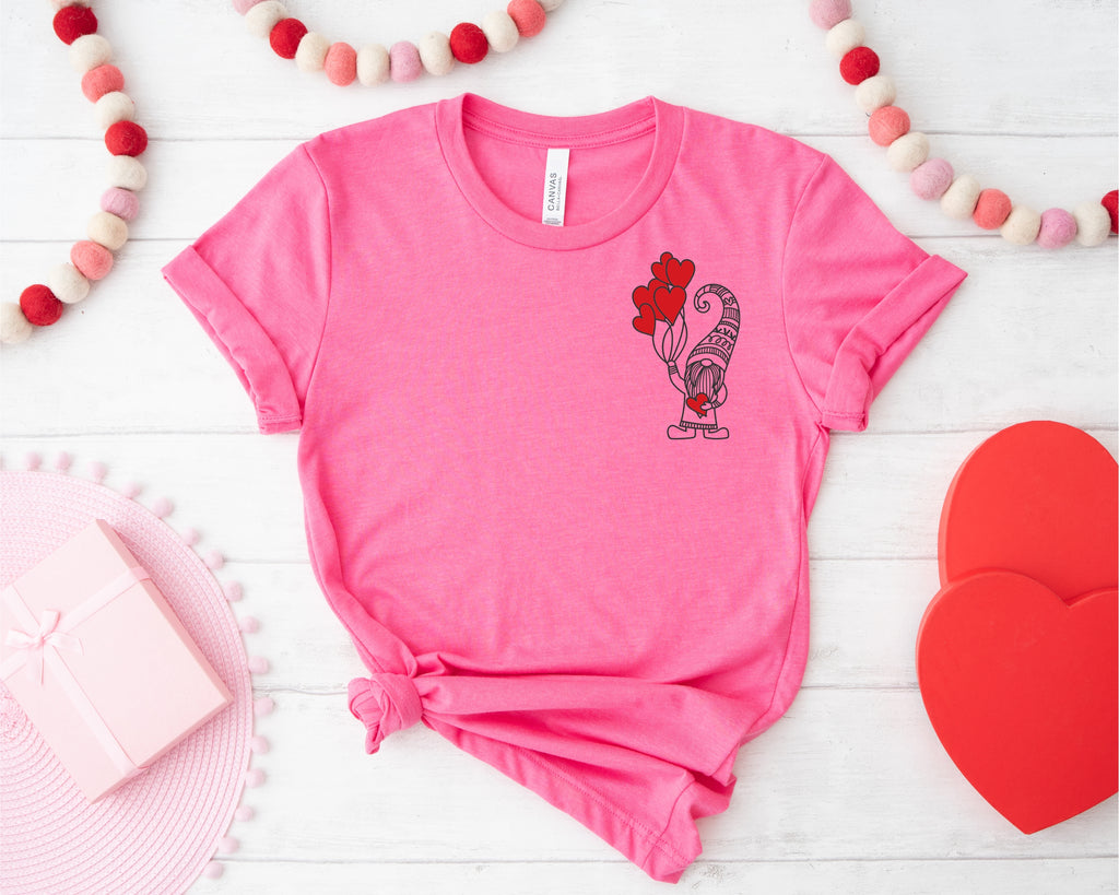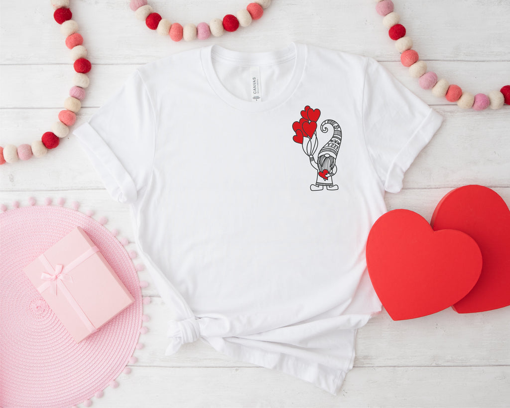 Fall in love with our adorable Valentines Gnome T-Shirt! Perfect for Valentine's Day or any day you're feeling the love, this cute and quirky tee is sure to become a staple in your wardrobe. Featuring a joyful gnome carrying a bunch of heart-shaped balloons, it's impossible not to smile when wearing this shirt. Made from soft and comfortable material, it's perfect for a casual day out or a fun-filled date night with your special someone