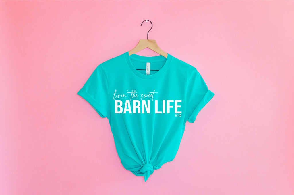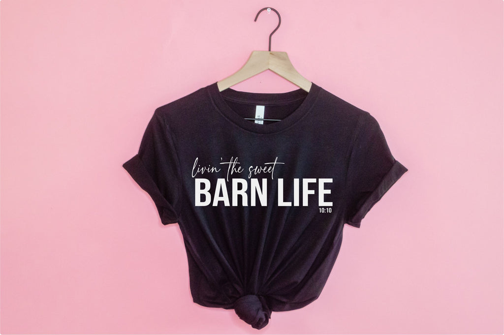 The 'Livin' The Sweet Barn Life' t-shirt is perfect for horse and animal lovers everywhere. Made with soft, comfortable fabric, it's the perfect way to express your love of the farm life. Experience the joy of livin' the sweet barn life in style!