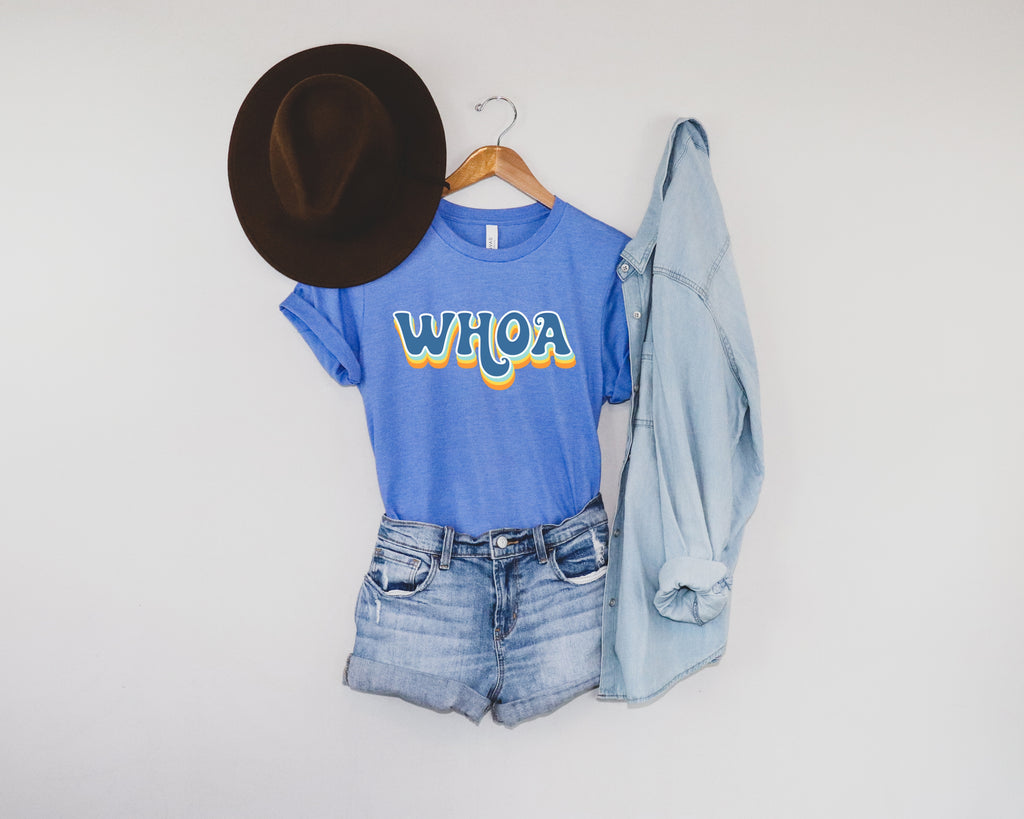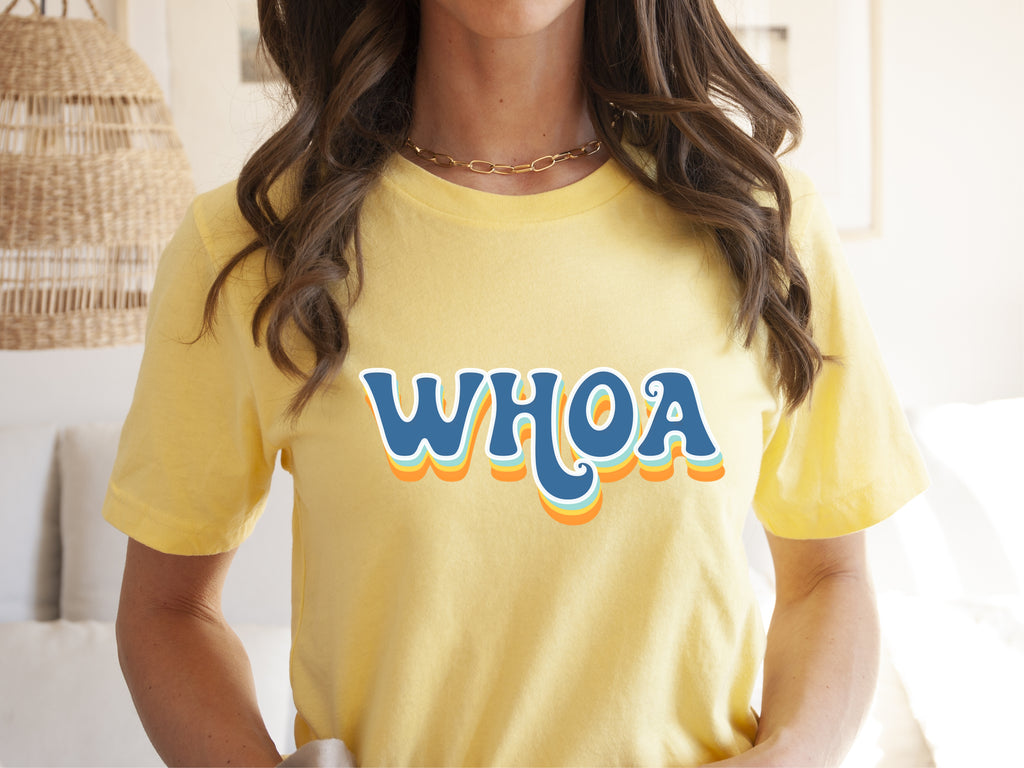 Through it back with our fun and playful WHOA retro t-shirt! Printed on soft and comfortable fabric, this T-shirt will be your favorite all season long.