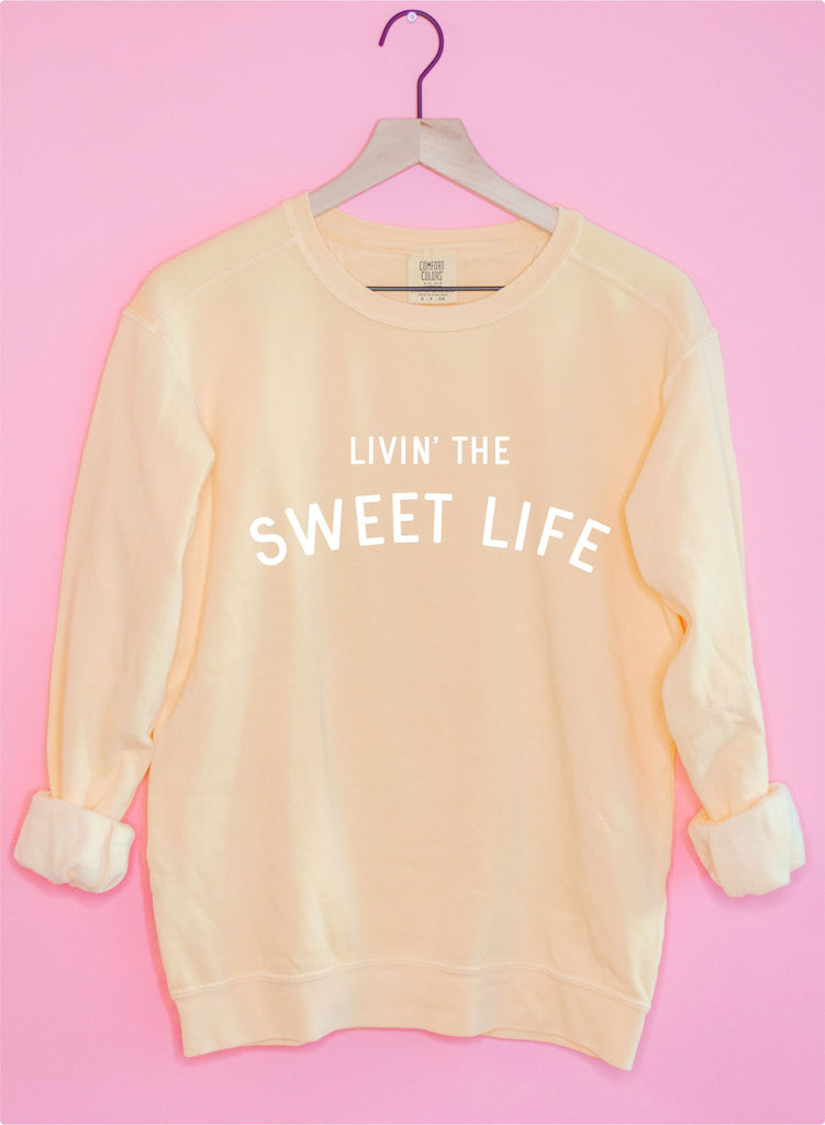 "Livin' The Sweet Life Sweatshirt" Our super soft midweight fleece garment dyed sweatshirts are so comfy and perfect for chilly summer nights or cold winter days. Featuring a crew neck, long sleeve sleeve and made with a blend of cotton/poly