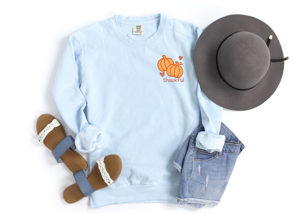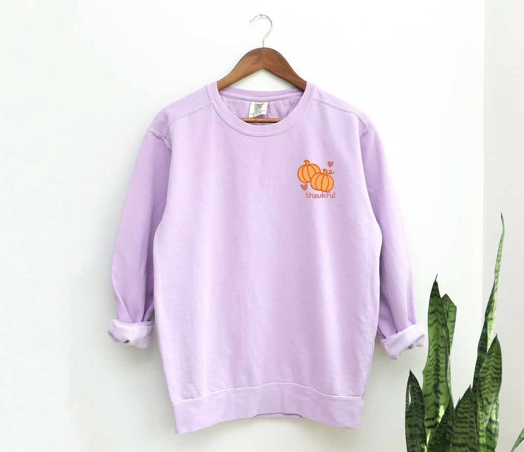 "Thankful Pumpkins" Our super soft midweight fleece garment dyed sweatshirts are so comfy and perfect for chilly summer nights or cold winter days. Featuring a crew neck, long sleeve sleeve and made with a blend of cotton/poly