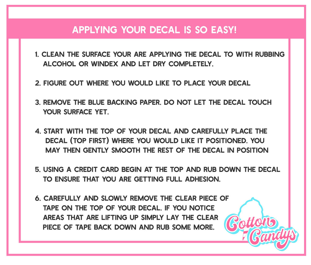 Upon receiving your order, please take a moment to review the application instructions provided in your package. Please take special care to apply your monogram decal to the surface of your choice. The monogram decal does require you to be gentle and patient during application. At anytime if you feel unsure about the process, please don't hesitate to contact me.